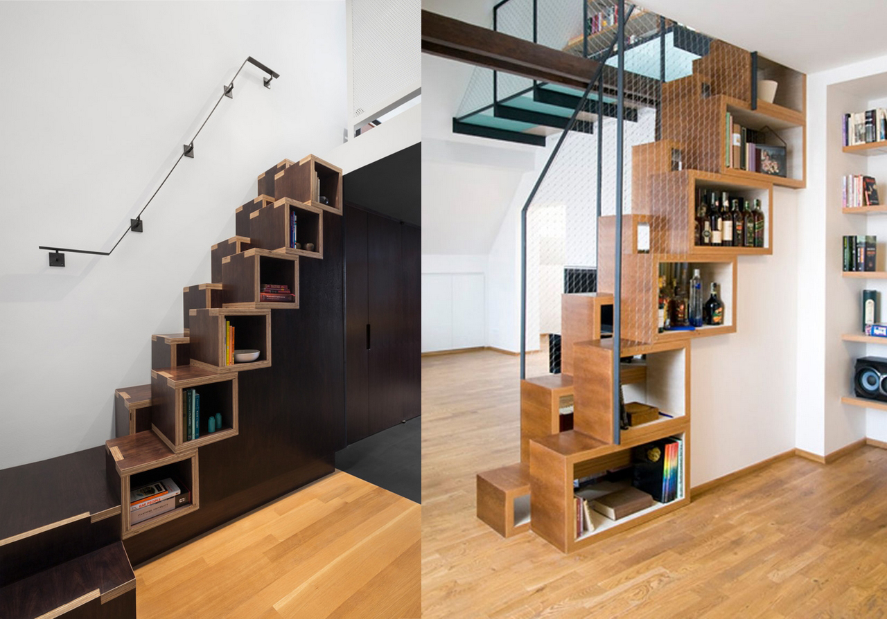 -Sự kết hợp giữa kệ sách và cầu thang là ý tưởng hoàn hảo cho những không gian sống nhỏ, hẹp. Nhưng nó còn thú vị hơn khi hòa trộn cùng cấu trúc bậc thang xen kẽ hút mắt người nhìn khi bước vào căn nhà