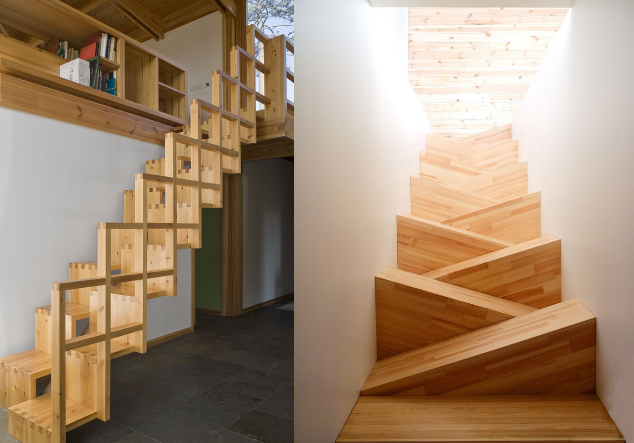 -Cầu thang với các bậc gỗ và thanh vịn sắp xếp độc đáo trông như một tác phẩm nghệ thuậtTùy thuộc vào phong cách, kiểu dáng trang trí và chất liệu sử dụng mà bộ cầu thang xen kẽ sẽ tập trung vào những chi tiết khác nhau. Chiếc cầu thang dưới là sự kết hợp ăn ý giữa các hình khối và chất liệu gỗ, phù hợp với tổng thể không gian sống đơn giản, mộc mạc của chủ nhà.